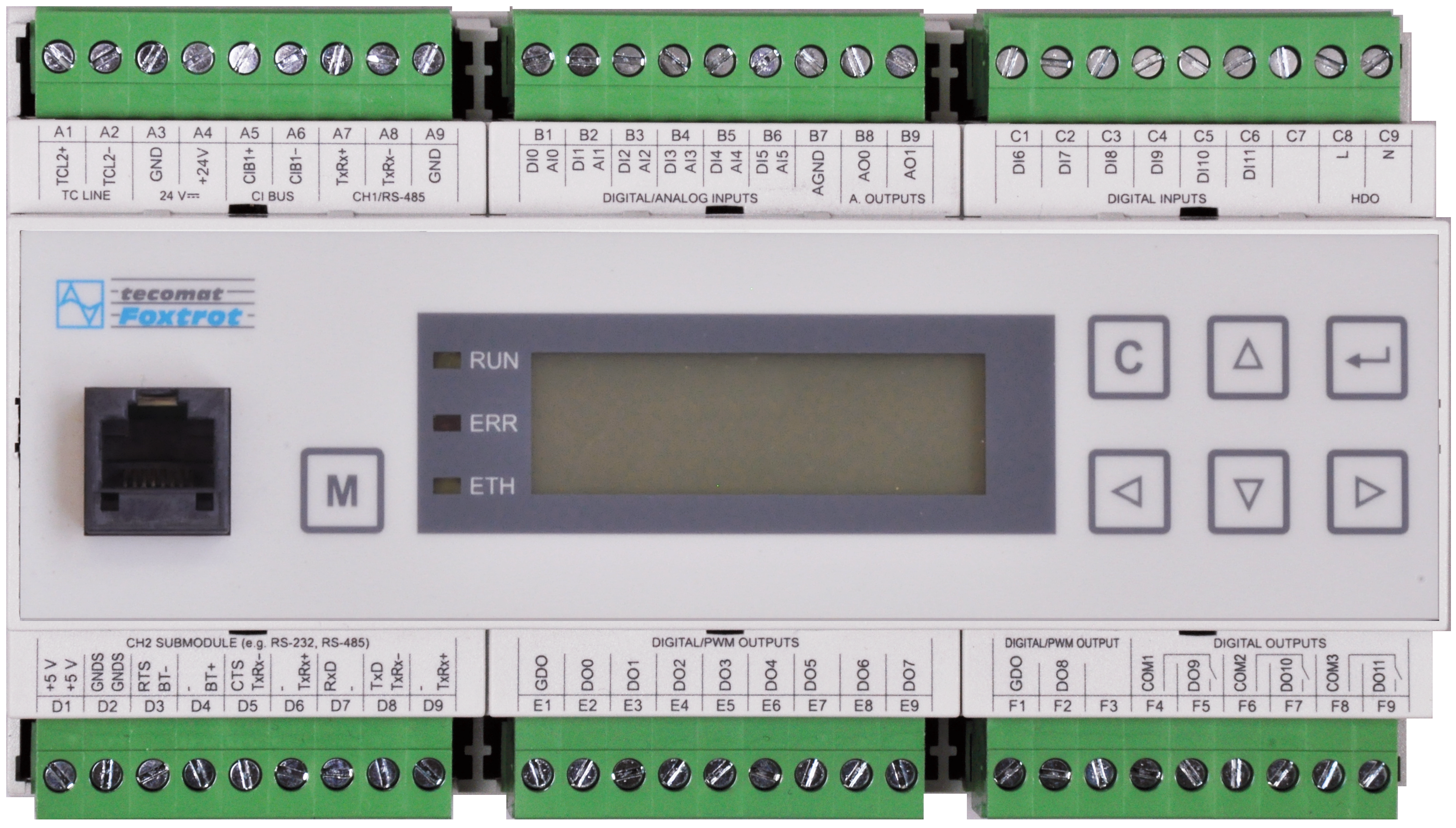 CP-1096, CPU, LCD 4x20 char, 6 kláves, ETH100/10, 1x RS232, 1xSCH, 6xAI/DI, 6xDI, 1x DI/230VAC; 2xAO,9xDO (PWM); 3xRO, 1x TCL2, 1xCIB, SD card slot, 384KB program memory, 6192KB variables memory, 512 KB DataBox,