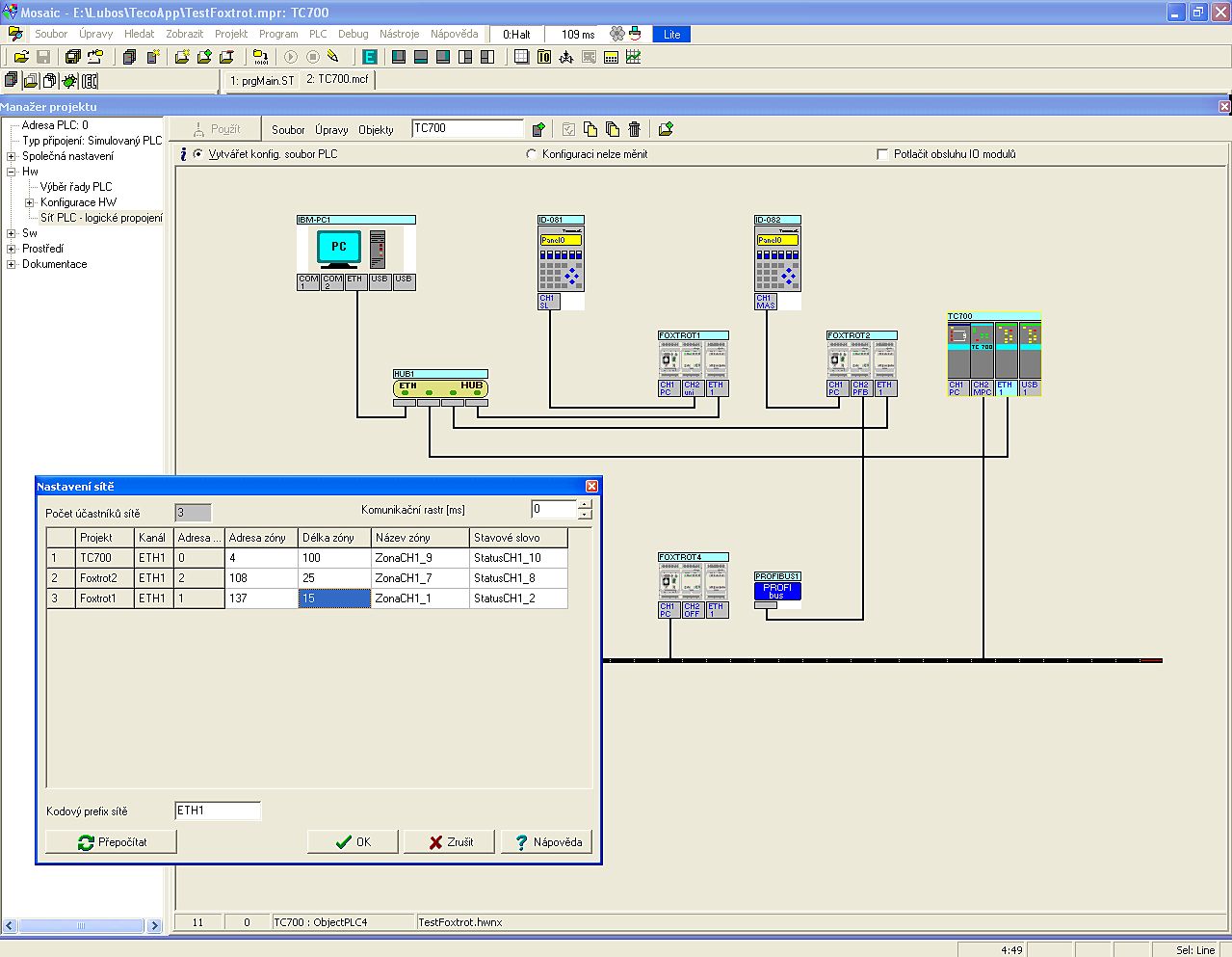 Správce projektu je ústřední místo, kde lze nastavit všechy základní parametry projektu, konfiguraci jednotlivých PLC a jejich propojení do síťě. Okno Správce projektu je otevřeno neustále. Lze ho zmenšit a přepíná se na něj kdykoliv ikonou v levém horním rohu, první v liště textových nabídek menu. Podrobněji je práce s ním popsána v příručce Začínáme s Mosaicem.