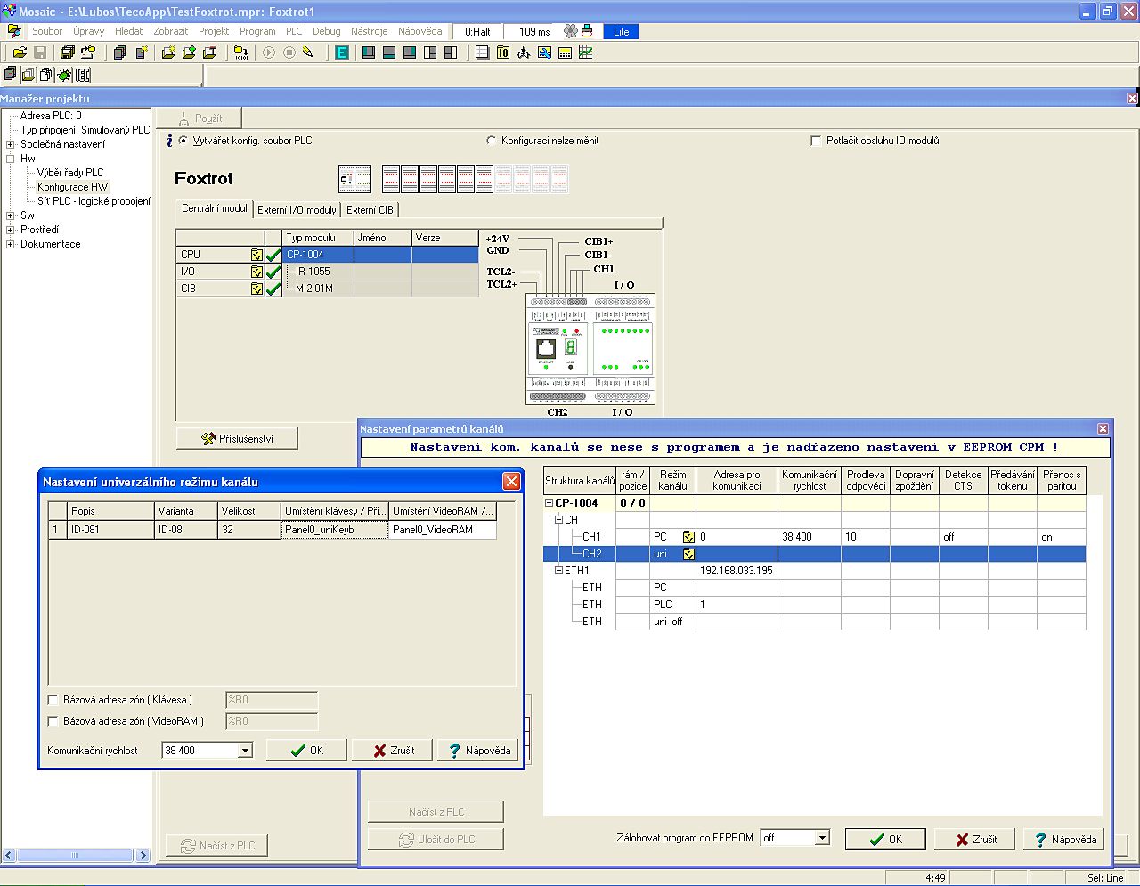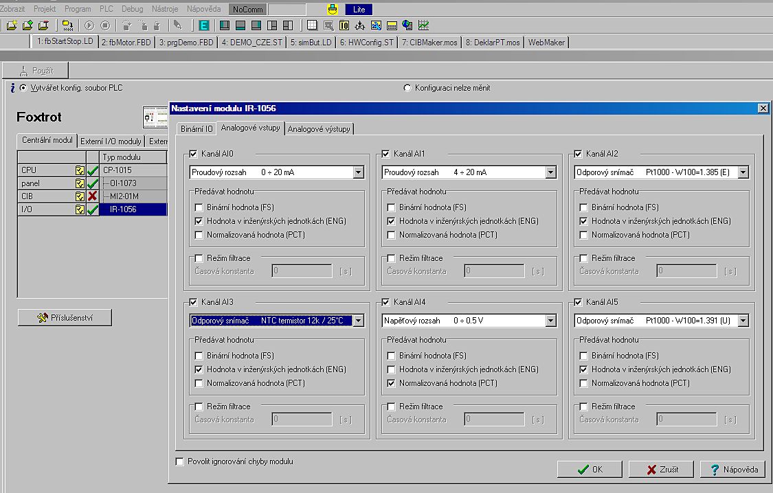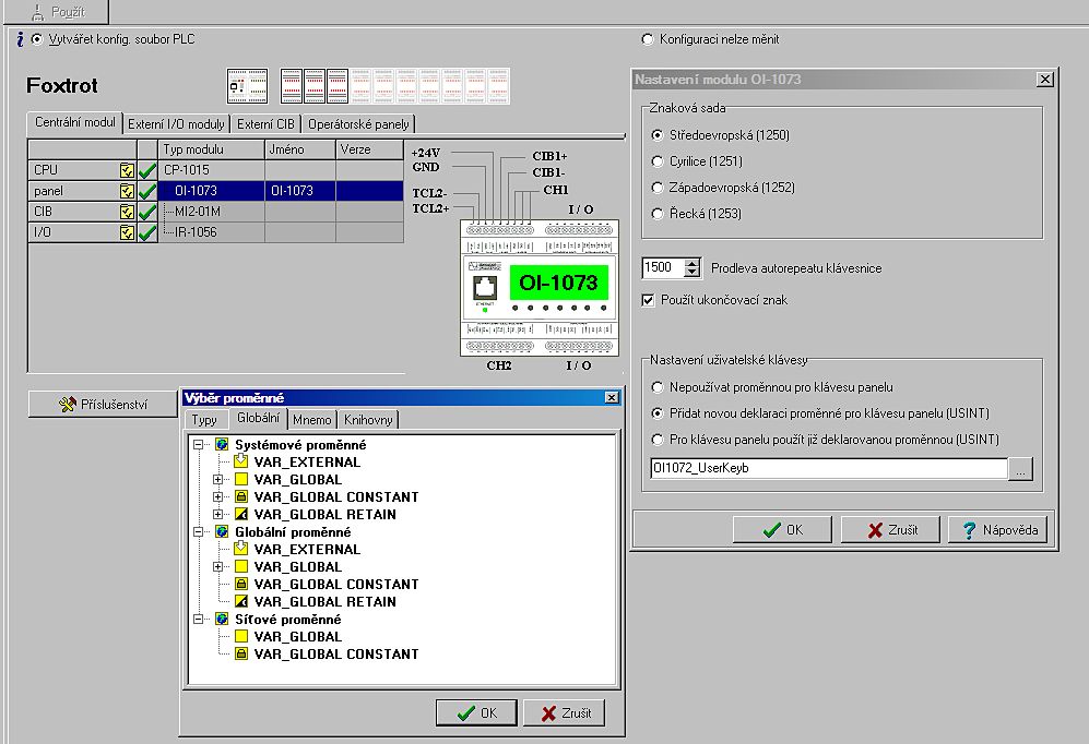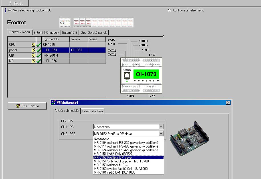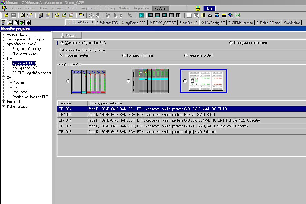 Volba typu cílového PLC: Foxtrot, TC700, TC 650, nebo starší řady, které nejsou programovatelné podle IEC: NS950, TC400/500/600, TR050/200/300 Volba typu centrální jednotky nebo základního modulu ve vybrané řadě: Foxtrot a CP-1004, CP-1015....nebo TC700 a CP-7003, 7004 atd.