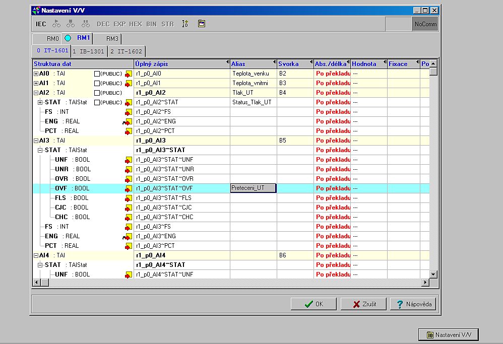 Po stisku tlačítka I/O - Nastavení V/V na spodním okraji konfiguračního okna, nebo po stisku stejné ikony v horní nástrojové liště s objeví kompletní tabulka odpovídající konfiguraci I/O struktury konkrétního projektu. Kromě implicitně přiřazených názvů, které lze použít vždy a které svojí logikou odpovídají adresaci modul po modulu (r1_p0_AI2 - odpovídá analogovému kanálu 2 umístěném v modulu v rozšiřovacím rámu R1 na pozici P0 (u Foxtrotu na logické větvi1 na TCL2 v modulu s adresou nastavenou točítkem na 0) je možno přiřadit každému vstupu Alias - symbolické jméno, které odpovídá charakteru jeho použití v projektu.
