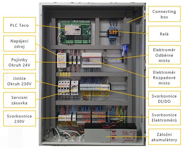 - robustní RTU jednotku s napájením, elektroměry ABB a PLC TECO,