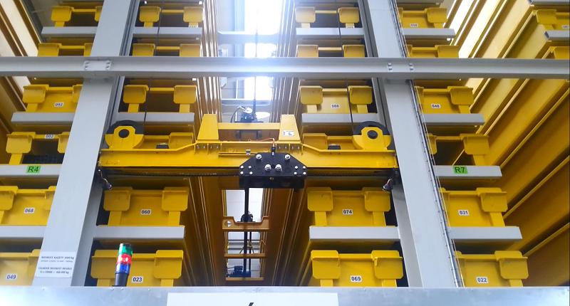 Regálové zakladače jsou základním vybavením automatizovaných skladů v nejrůznějších odvětvích. V Železárnách Podbrezová, tedy v hutnickém podniku, instalovala firma KPK z Martina sklad s kazetami na tyčový materiál s uchopováním za boční stranu kazety a s úplnou evidencí skladovaných položek. Obrázky jsou doplněny videem s pohybem kazety napříč skladem.