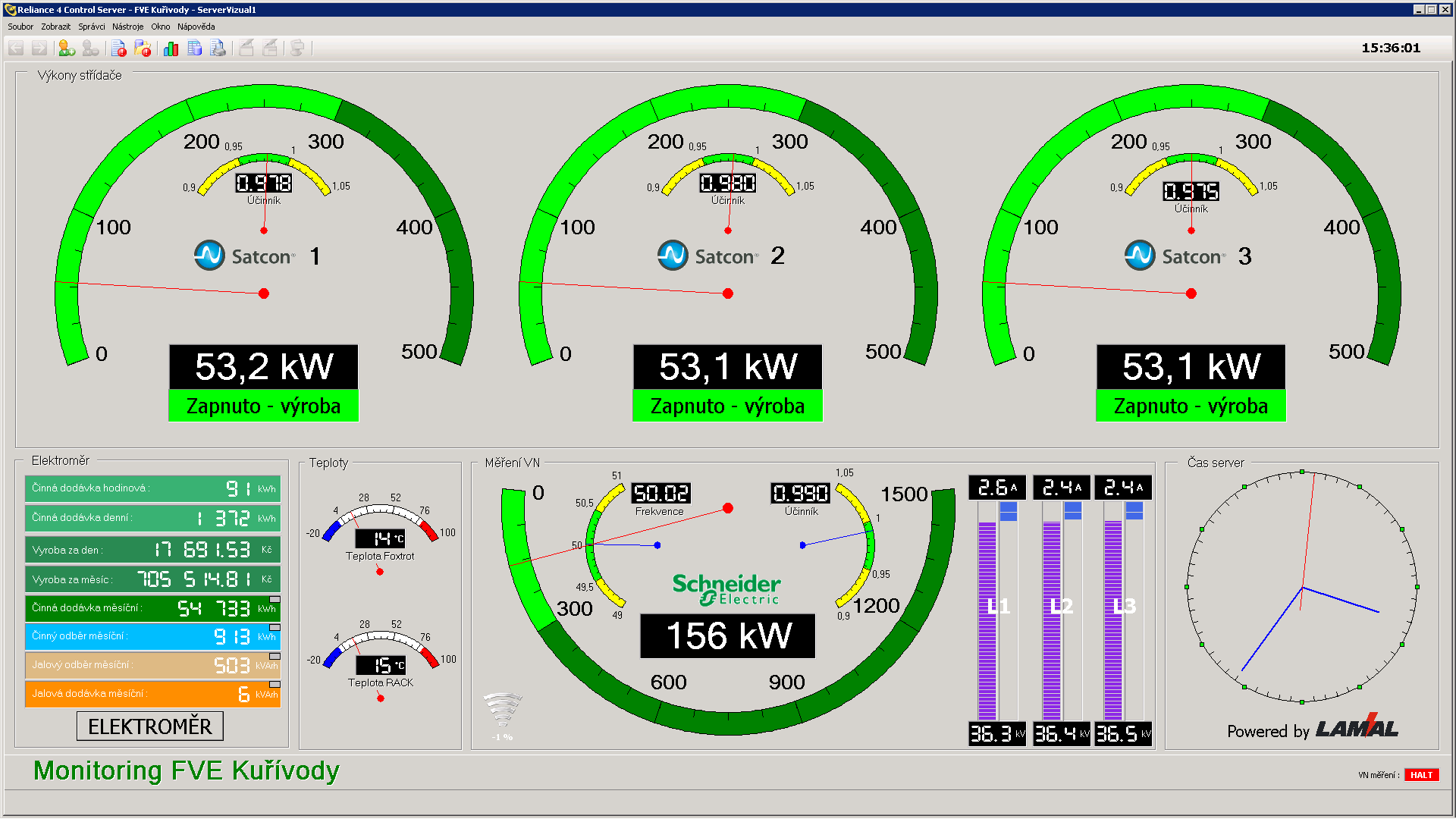 - sledování stavu elektroměru ČEZ – prostřednictvím datové komunikace, která je opět realizována pomocí PLC Tecomat Foxtrot, jsou přímo z elektroměru vyčítána data o výrobě a spotřebě (kWh) a jalových složkách (kVar).