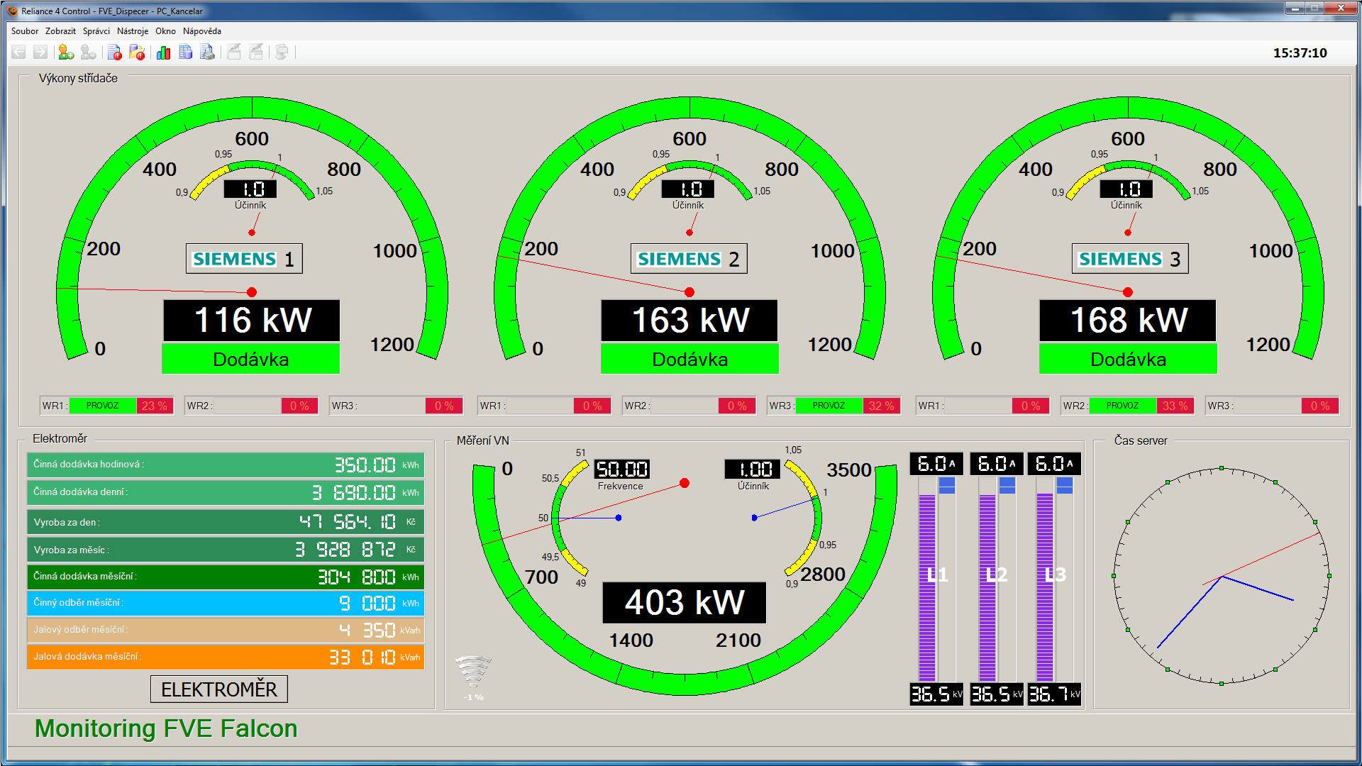 Prostřednictvím vizualizačního SCADA systému Reliance 4 jsou data z jednotlivých FVE elektráren soustředěna na centrální dispečink. Operátor vidí online aktuální stav všech zařízení. Současně dispečink slouží jako hlavní uložiště dat, které lze kdykoliv využít k analýze formou tabulkových či grafických sestav.
