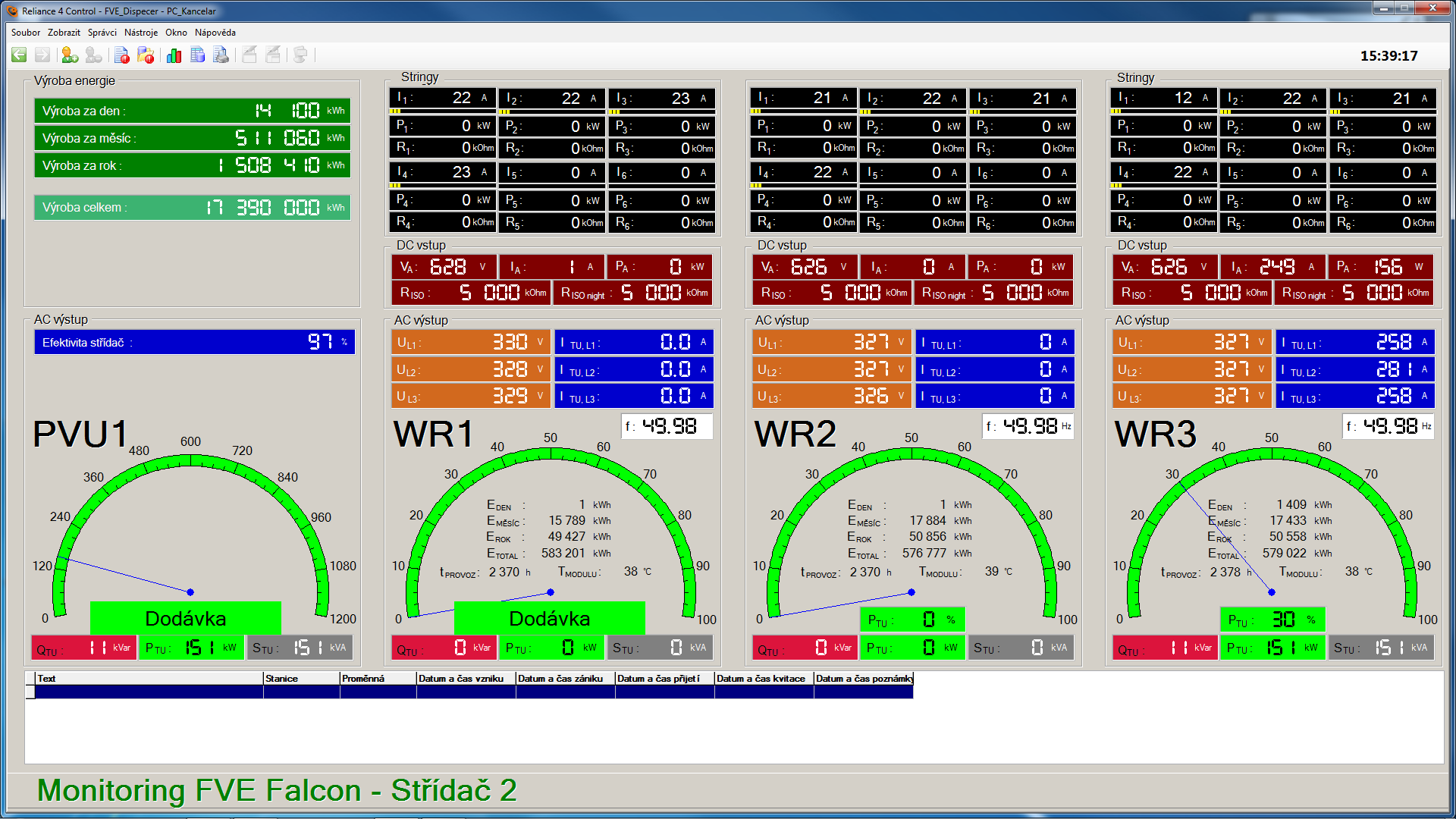 - sledování stavů střídačů – prostřednictvím datové komunikace OPC jsou online sledovány provozní data a poruchová hlášení jednotlivých sřídačů.