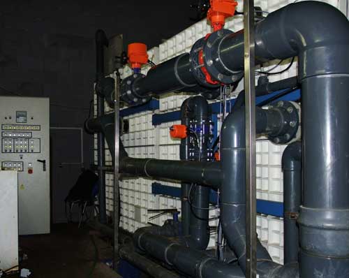 Řídící systém zde sestává z centrální jednotky Foxtrot CP-1005 a příslušných I/O jednotek pro měření veličin (hladin nádrží, tlaků v okruzích čerpadel, apod.) a ovládání (klapek v nádržích, bypassu a systému automatického čištění filtru, apod.)