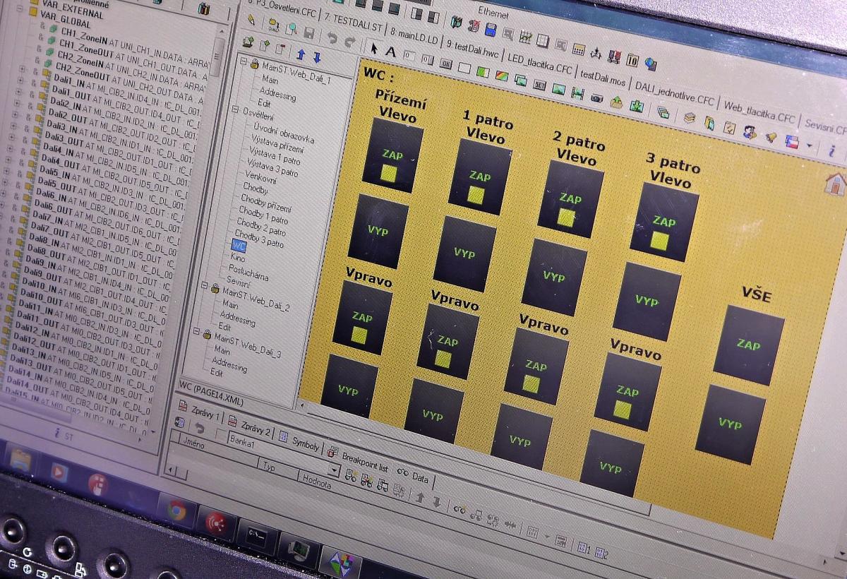 Těší nás, že v zázemí tohoto osvětlení figuruje systém Tecomat Foxtrot. Konstatujme, že jeden jediný Foxtrot. Na celý objekt a na bezmála půl tisíce svítidel na 15 větvích sběrnice DALI.