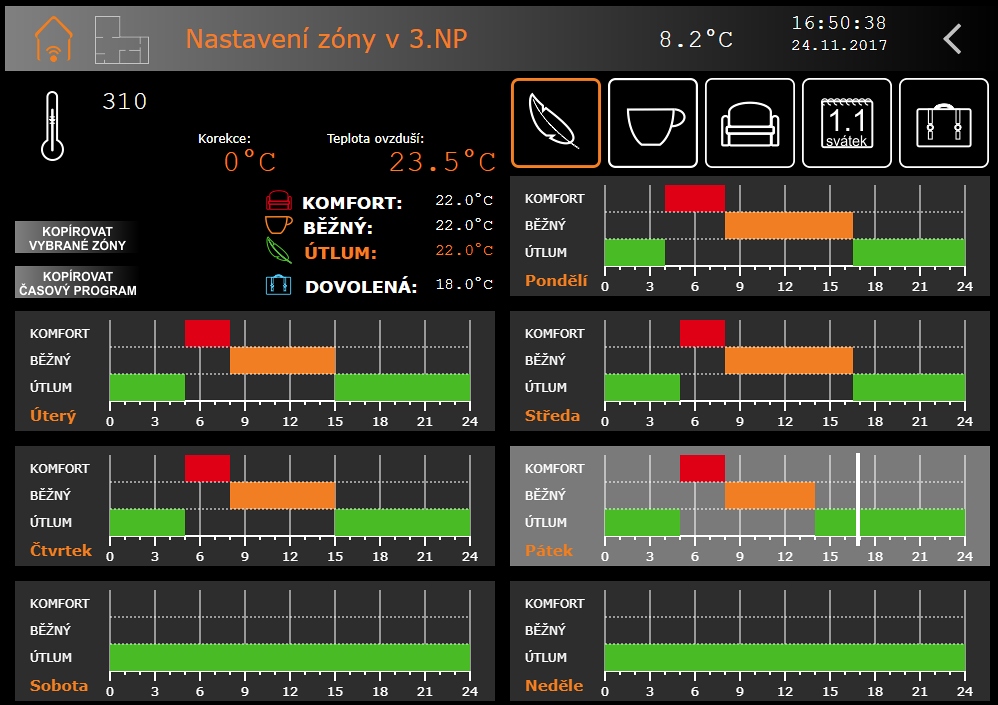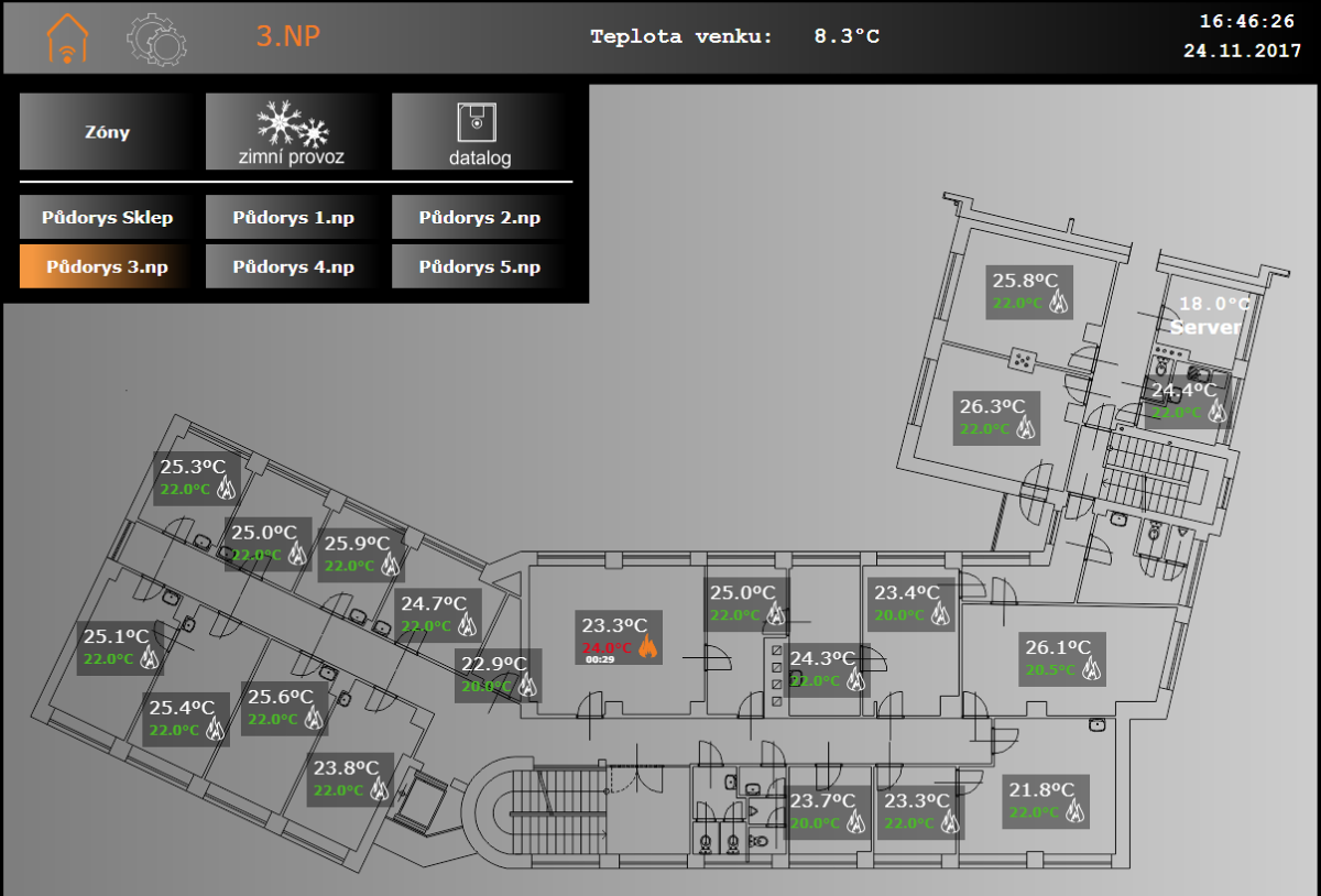 Celý systém lze mimo dotykové ovladače spravovat prostřednictvím intuitivní grafické vizualizace jak s přihlášením administrátora, tak i uživatele s definovanými užvatelskými právy.