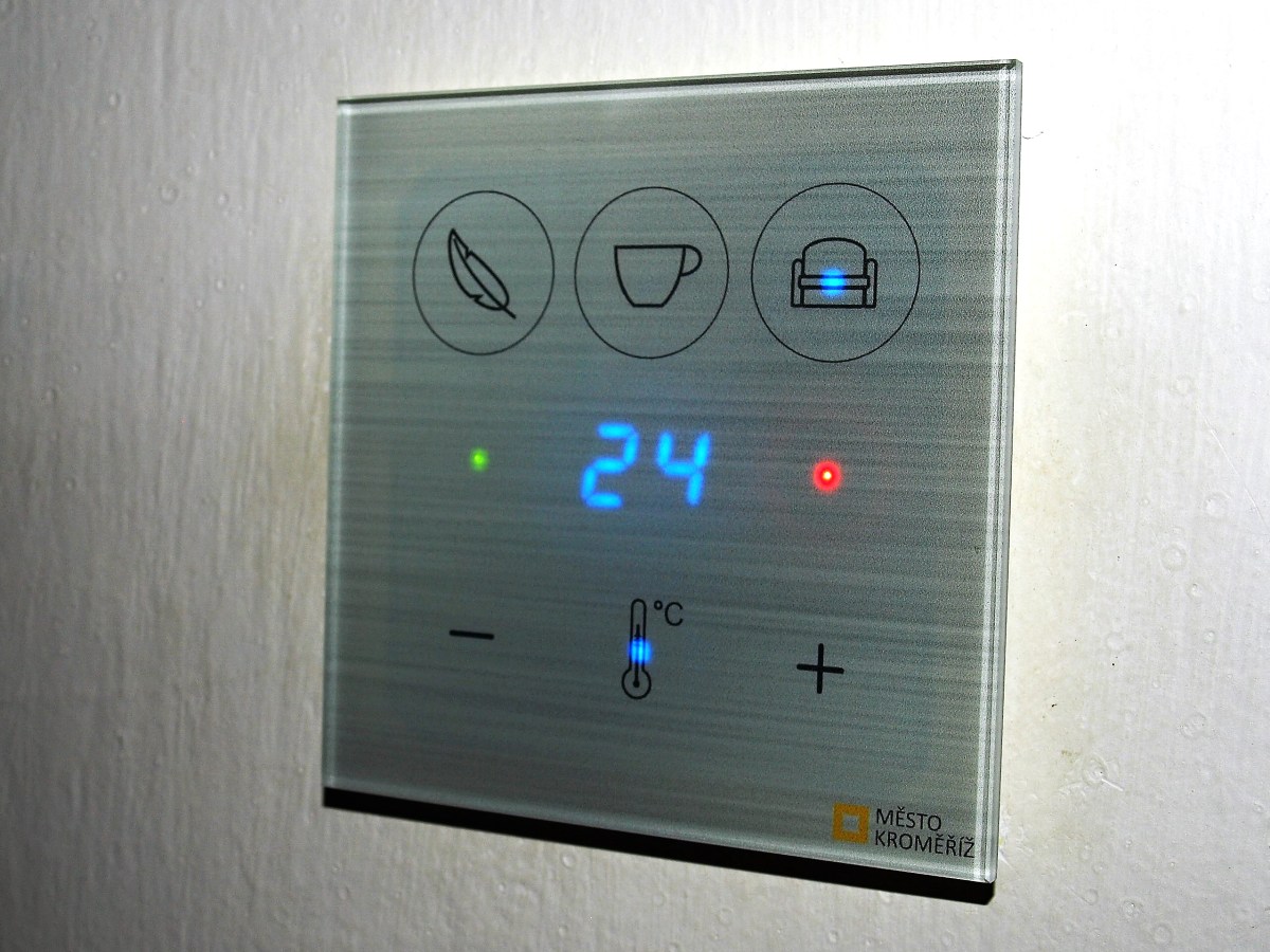 Výraznou novinkou v tomto řešení je vůbec první použití sběrnicových skleněných dotykových termostatů s LCD displejem, jejichž vzhled byl navržen na základě představ a zadání provozovatele objektu, včetně jeho loga.