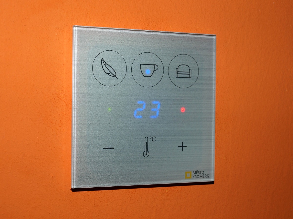 Nový termostat přináší jednoduché ovládání prostřednictvím 6-ti dotykových ploch, které je podpořeno indikací provozních stavů pomocí různobarevných LED a displeje, který zobrazuje jak naměřenou, tak i požadovanou teplotu. V tomto objektu se nachází 89 regulovaných místností, z toho je 80 místností osazeno tímto novým dotykovým ovládacím prvkem. Celkově je regulováno 119 elektro-termohlavic. Zónová regulace je provázána s vlastní regulací plynové kotelny s několika topnými okruhy.