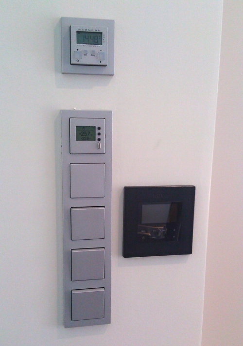 V každé místnosti administrativní části je prováděno měření prostorové teploty pomocí RCM2-1, nebo C-IT-0200R. Tyto prvky jsou designově uzpůsobeny stávajícím ovladačům GIRA s konkrétním RAL odstínem. Na základě tohoto měření je prostor v zimním období vytápěn otopnými tělesy, jejichž ventily jsou otevírány elektricky řízenými termo-hlavicemi PWM regulací.