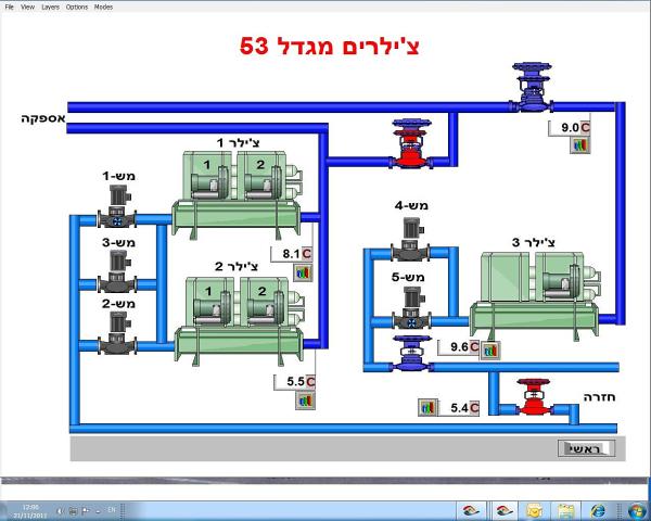 Vizualizace je provedena v systému Wizcon a jak je vidět z obrázků je v hebrejštině. V tabulkách se pak nastavují žádané hodnoty pro jednotlivé části budovy a pro různá roční období tak, aby byly splněny jednak vzduchotechnické parametry a zároveň bylo dosaženo úspor.