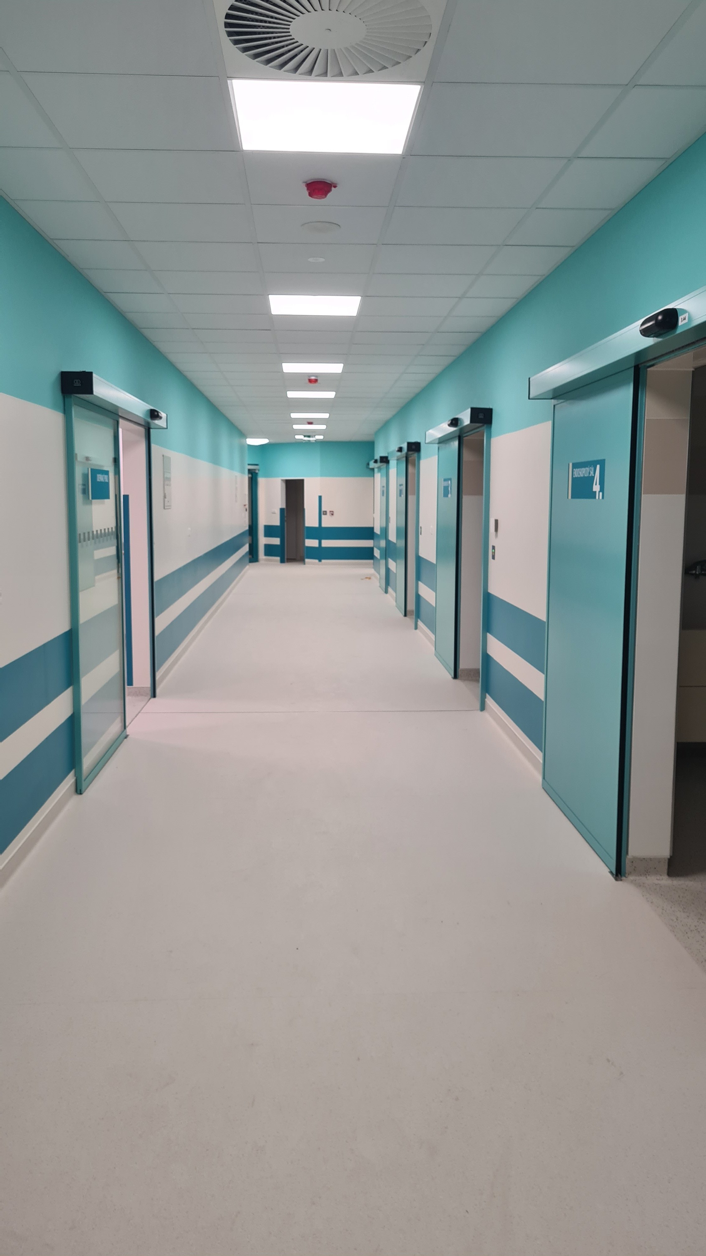 Vlastní ovládání sálů se realizuje na šesti skleněných dotykových zapuštěných panelech o rozměru obrazovky 22“ s FullHD rozlišením, na kterých je zobrazena vizualizace ovládání každého sálu. Tyto dotykové obrazovky jsou umístěny uvnitř sálu, proto musí vyhovovat specifickým podmínkám nemocničního prostředí. Cílem bylo vyřešit intuitivní grafické rozhraní, prostřednictvím kterého by byly všechny nutné funkce k dispozici na jedné obrazovce. Vizualizace sálu obsahuje nastavování osvětlení, monitoring hodnot tlaků medicinálních plynů a jejich alarmů v případě hodnot mimo požadovaný rozsah. Také se signalizují poruchy izolační soustavy – přehřátí izolačních transformátorů a izolační stav.