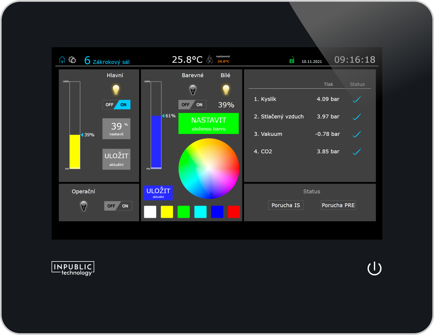 Poměrně náročným úkolem bylo vyřešit řízení RGBW LED panelů, když si operatér potřebuje nastavit vhodnou barvu světla pro endoskopický zákrok. Tato svítidla jsou řízena prostřednictvím předřadníků DALI2 (Device Type 8), které mají oproti starší implementaci protokolu DALI (Device Type 6) pouze jednu adresu a tou se nastavuje jak barevná složka RGB, tak i bílá složka a svítivost.