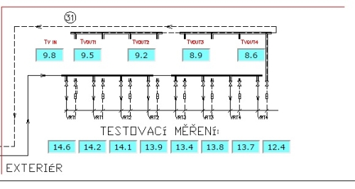 Celý systém je vybaven 39ks teplotních čidel a 9ks kalorimetrů, které zabezpečují dokonalý přehled o dodávané a odebírané energii v jednotlivých režimech provozu. Na výřezu vizualizace jsou vidět např. teploty média v jednotlivých vrtech a kontrolní teploty. Těchto osm měřících bodů je rovnoměrně rozmístěno mezi prvním a druhým vrtem.