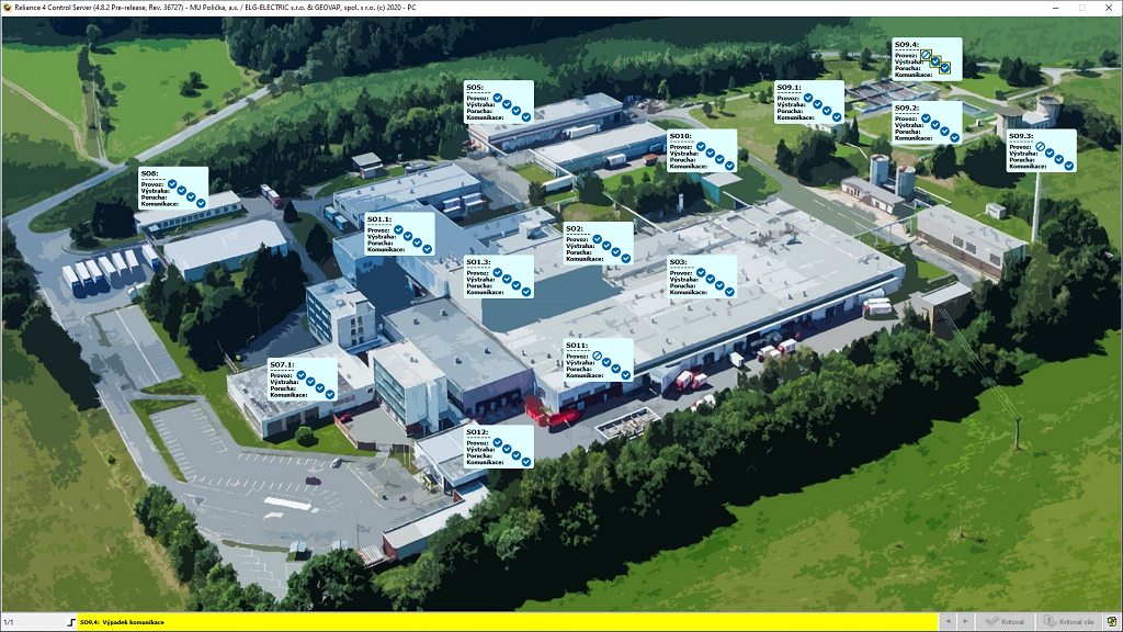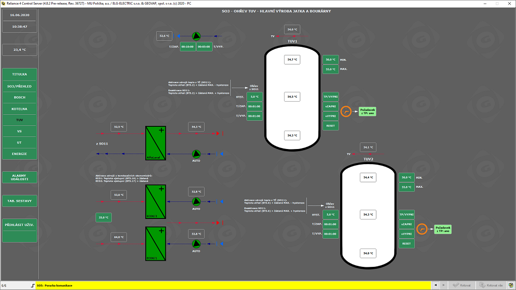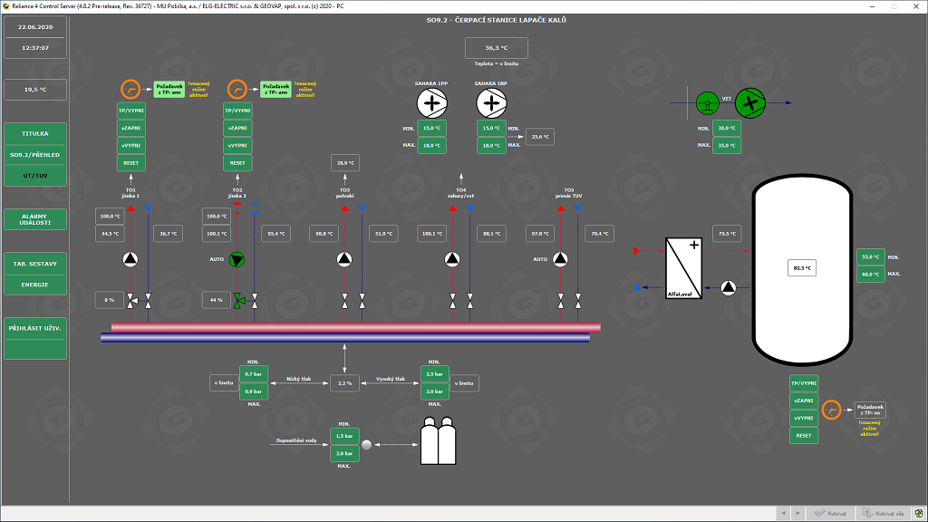 Na dispečerském počítači je nainstalován SCADA/HMI systém Reliance a je umístěn v dispečinku s nepřetržitým dohledem. Reliance získává data z jednotlivých PLC a prezentuje je v přehledných grafických schématech tak, aby obsluha byla okamžitě informována o stavu řízených technických zařízení a mohla řešit případné problémy.