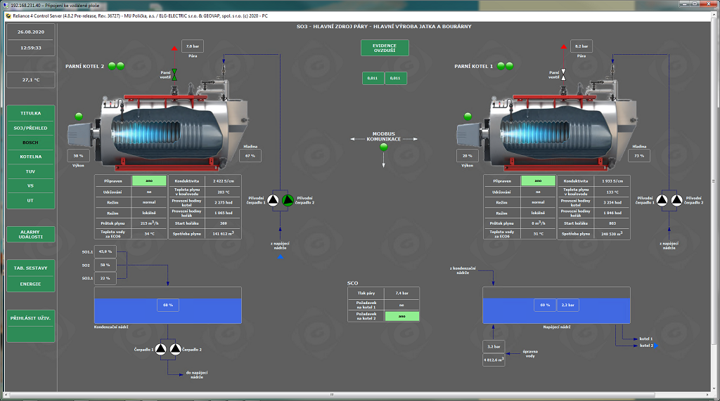 • 2 parní kotle Bosch (hlavní zdroje páry, komunikace přes Modbus)