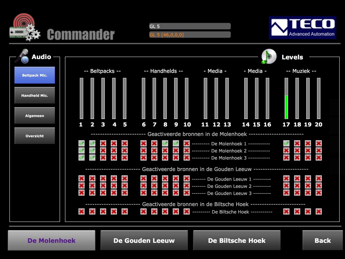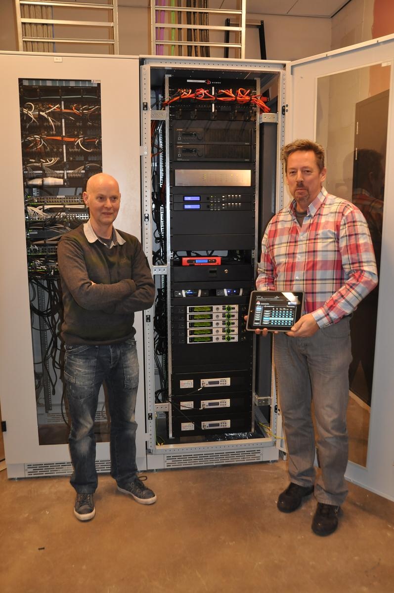 V jedné z technických místnosti je celé jedno pole rozvaděče naplněno kompletním audio/video zařízením společně se třemi Foxtroty v OEM provedení Každý řídí tři až šest z celkových patnácti sálů. Nahoře jsou dva multiroom audiozesilovače firmy BOSE. Každý s výkonem 4kW, které jsou schopny rozdělit mezi 2 až 8 kanálů. Pod nimi je přepínací audio matice ESP00 od stejné firmy. Následuje dvojice přepínacích matic 4x4 videosignálu HDMI od firmy CYP. Dále jsou tu zdroje AV signálu: internetové rádio a výstupy z 10 bezdrátových mikrofonů. Výsledné AV signály (HDMI by CAT6) jsou do velkých sálů rozvedeny po stejném kabelu jako TCP/IP data. Uživatelské ovládání je přes standardní webové stránky Foxtrotu vyvedené na dotykový panel ID-28 panel v každém sále. Ovládací stránky jsou dostupné i na větších stránkách na přenosných iPadech.