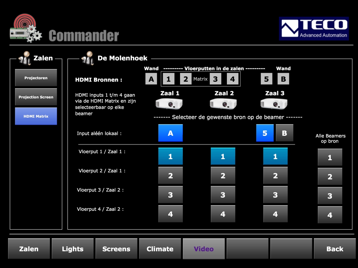 V každé místnosti je ve stropě malá jednotka s moduly 1x C-HM-113M s diskrétními a analogovými vstupy a výstupy a 1x SC-1101 se sériovým kanálem RS-232/485 tyto moduly řídí sluneční clony, systém klimatizace, výtah na projektor i projektor samý, projekční plátno a žaluzie mezi skleněnými panely směrem do chodby. Jsou tu i detektory pohybu a detektory pohyblivých stěn mezi sály. Z nich se odvozují automatické rekonfigurace logiky ovládání všech instalovaných prvků. V každém sále je řídicí stůl s ovládací skříňkou s dotykovým panelem ID-28, síťovou zásuvkou a HDMI konektorem. Stoly se dají přemisťovat a připojují se do síťové zásuvky a sítě LAN do rozvodnic skrytých v podlaze sálu.