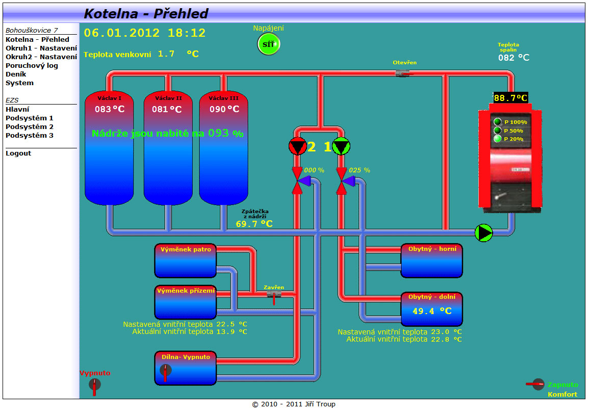 Vizualizace je řešena integrovaným webmakerem. Veškeré ovládání kotelny je řešeno pouze přes webové rozhraní.