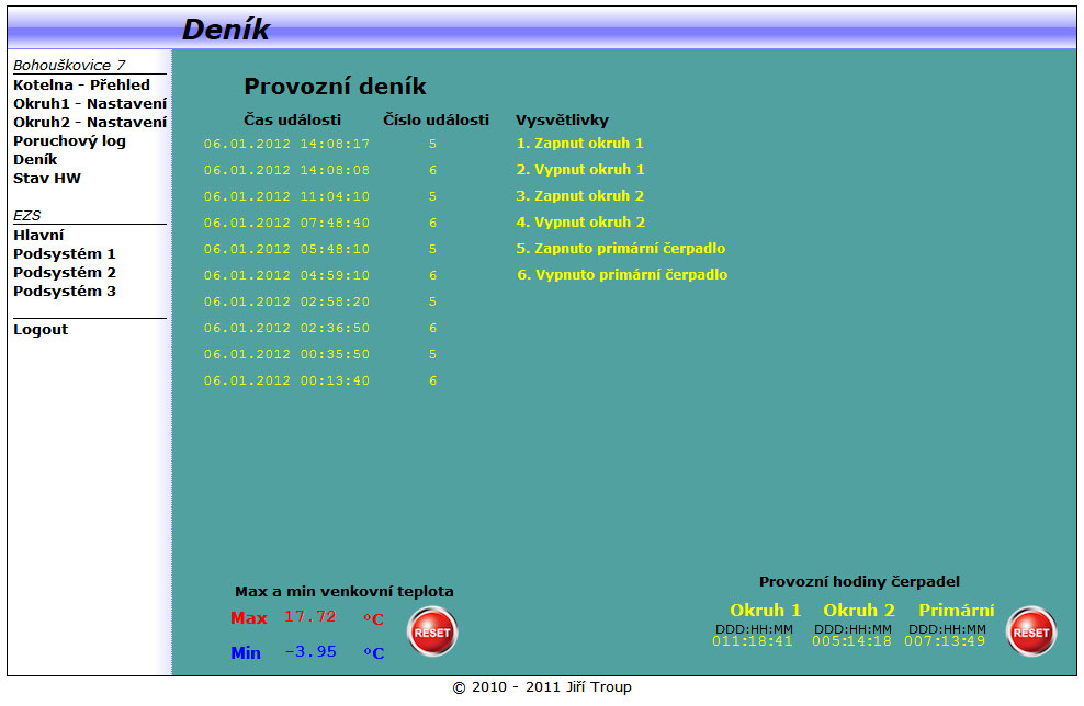 - pravidelná archivace dat (teploty, provozní hodiny, meteodata, EZS)