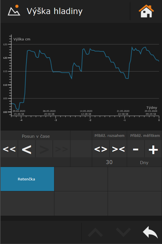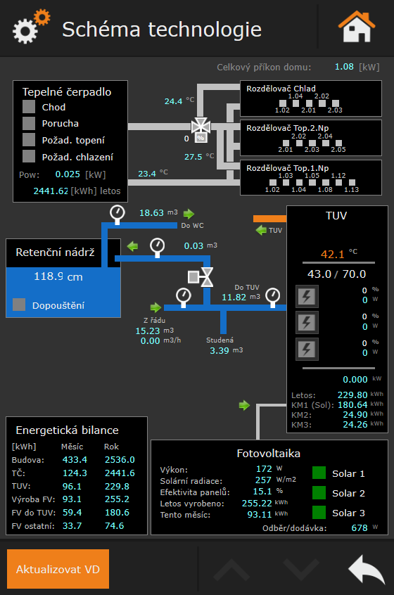 Uživateli je k dispozici celá řada grafů spotřeb energií, stavu vody v retenční nádrži a pod.