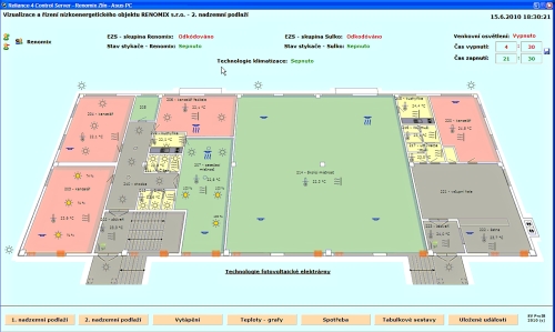 - měření spotřeby elektrické energie prostřednictvím pulzních elektroměrů (hlavní elektroměr, elektroměr nájemní plochy a elektroměr tepelného čerpadla) - archivace dat do databáze dBase,