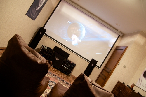Spouštění plátna domácího kinav domácím kinosálu – díky řídicímu systému Foxtrot se stiskem jednoho tlačítka spustí sled úkonů, které v okamžiku oživí domácí kinosál – spustí plátno, zatáhnou rolety /pokud je venku světlo/, zapnou domácí kino a nastaví vnitřní osvětlení kinosálu na optimální scénu. Podobně je Foxtrotem řízené i zahradní exteriérové kino.