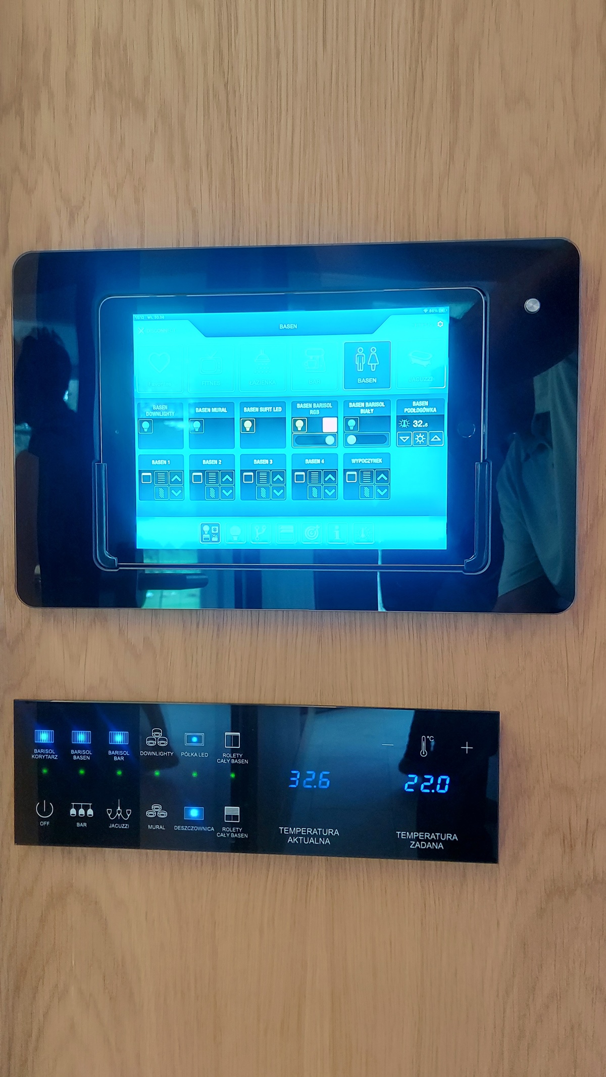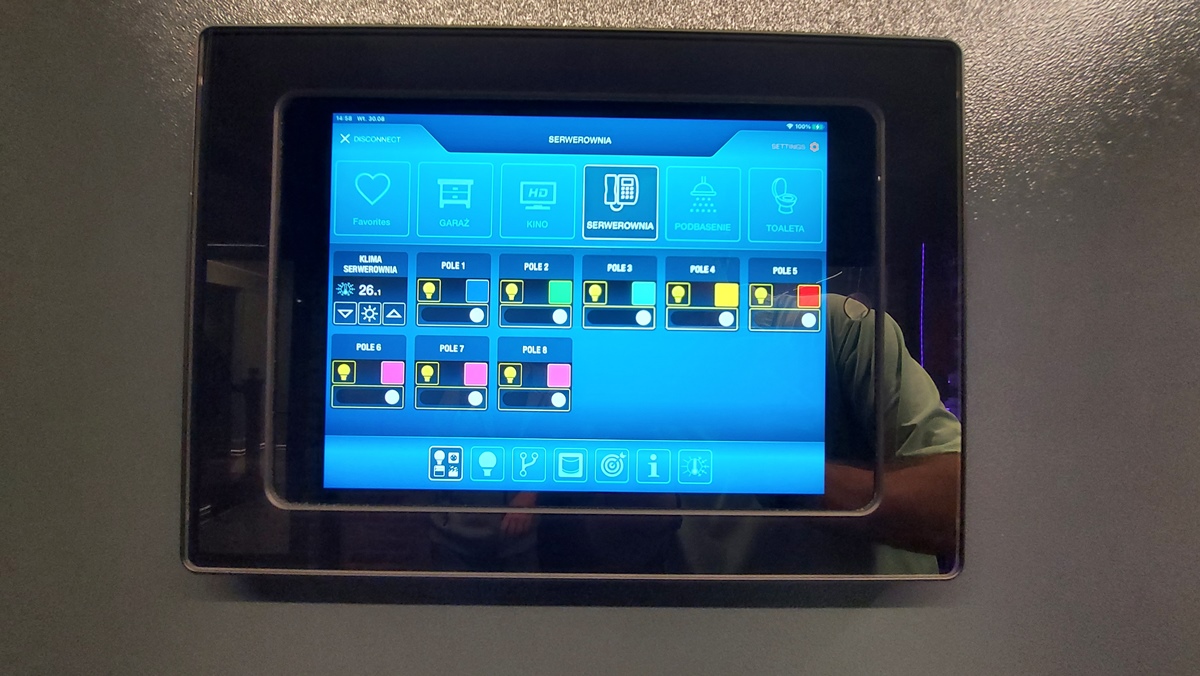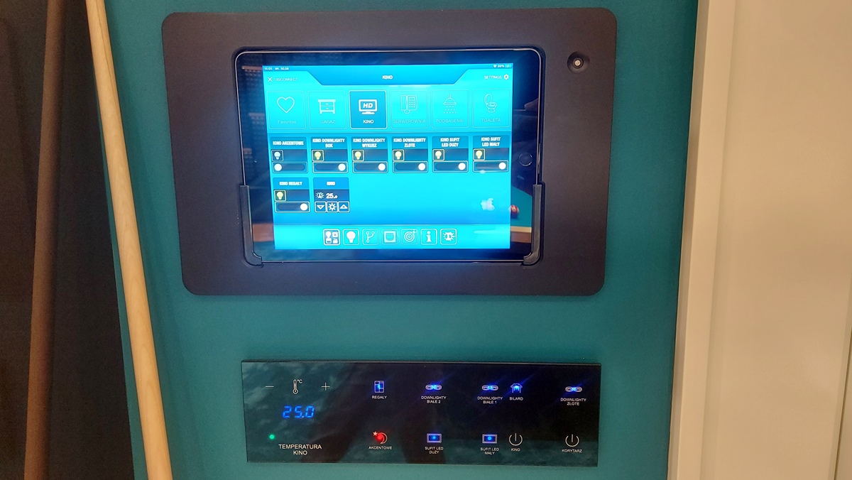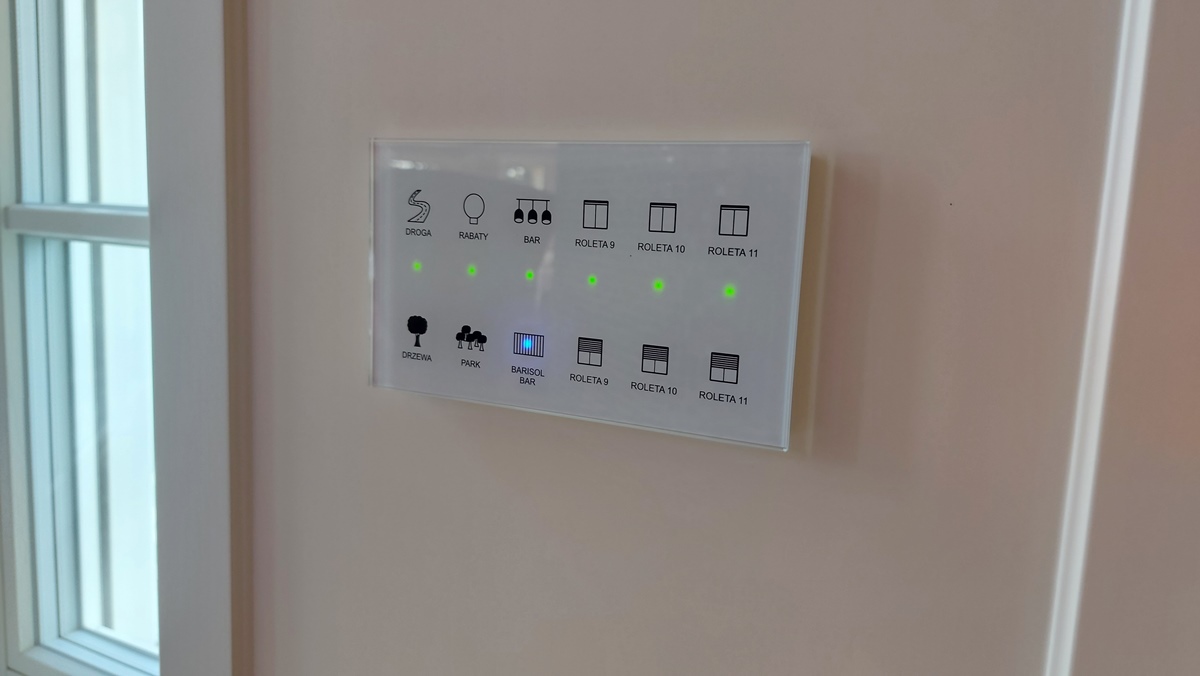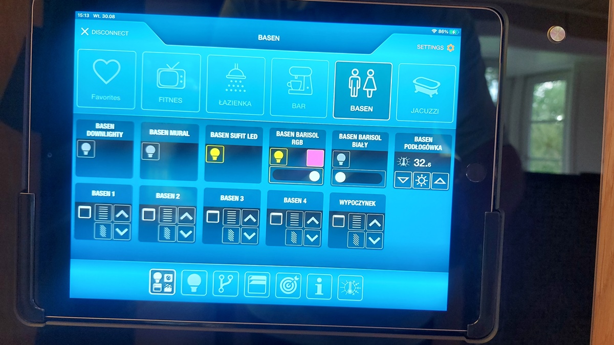 - řízení: osvětlení, vytápění, klimatizační jednotky, rolety, venkovní osvětlení, park, příjezdové cesty, světelné scény RGB v prostorách bazénu