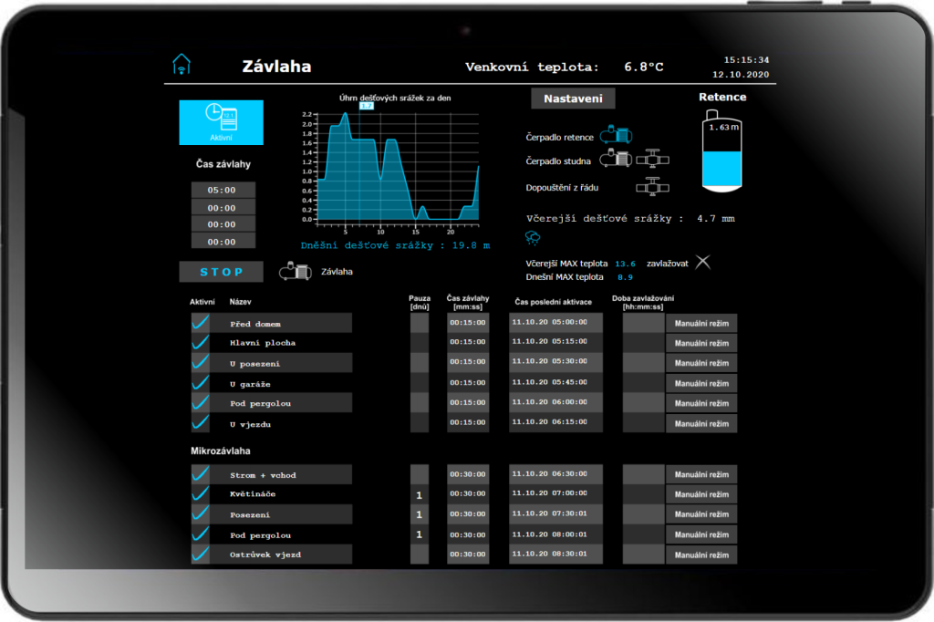 - přesné hlídání hladiny retenční nádoby v návaznosti na dešťové srážky a dopouštění ze studny, popř. domovního řádu