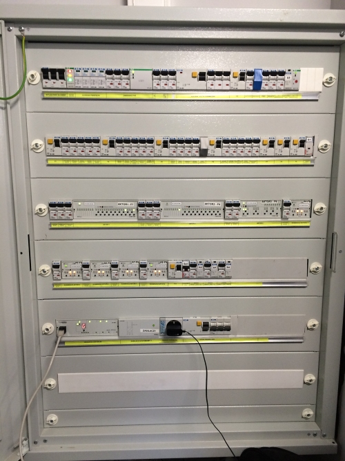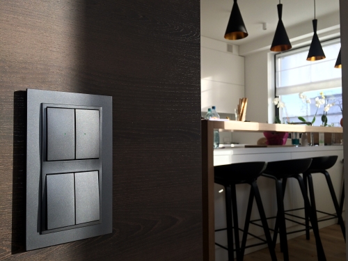 V domě jsou použity systémové vypínače na sběrnici CIB v designu Logus90 ANIMATO, které navíc měří teploty a prostřednictvím integrované LED diody signalizují stav ovládaného zařízení.