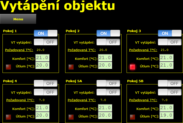 Integrace do již vybudovaného penzionu v resortu Avalanche Dolní Moravice - Jeseníky. Ovládání vytápění a odpojování napájení jednotlivých pokojů.