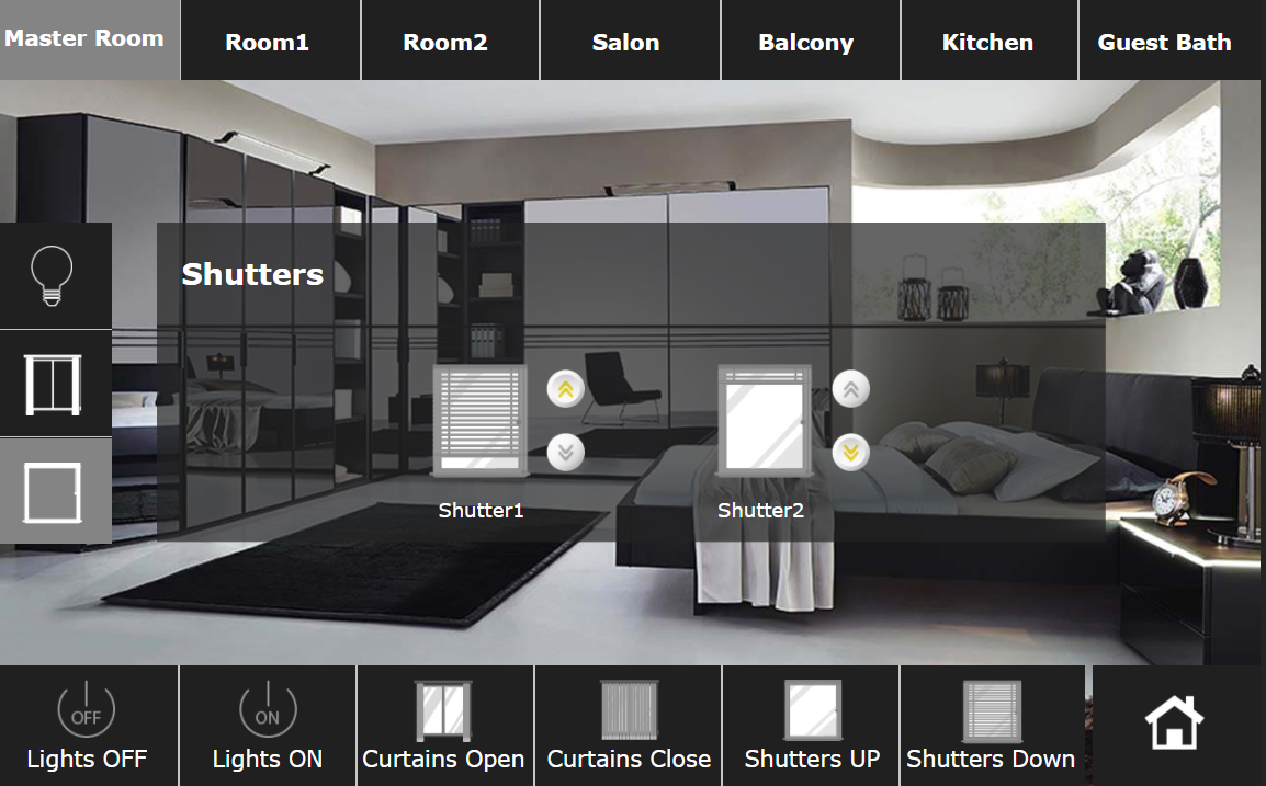 Integrace pomocí gateway se systémem ovládání žaluzií společnosti Somfy umožnila poskytnout obyvatelům apartmánu širší možnosti jejich ovládání. Lze je ovládat jednotlivě s pomocí dálkového