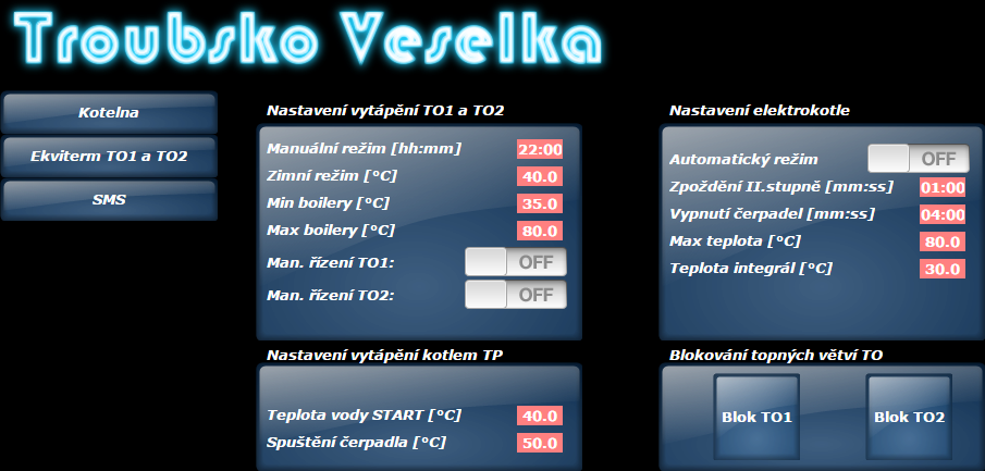 Vytápění s využitím více zdrojů energie. Cílem je automatické spuštění a řízení systému ÚT, s akumulací přebytků výkonu kotle na TP. V tomto případě je primární zdroj vytápění kotel na tuhá paliva, který energii akumuluje do dvou 1000l nádrží. Odtud je teplá voda distribuována podle požadavku systému (topit podle venkovní teploty) do dvou topných větví přes třícestné ventily (řízené PID).Těmi je výstupní teplota vody do radiátorů regulována a řízena ekvitermní regulací (dle ekvitermní křivky). Jako záloha je použit elektrokotel. Řízení výkonu elektrokotle je regulováno spínáním topných tyčí dle PID. Systém samozřejmě hlídá poruchové a poplachové stavy (přetopení, nízká teplota aku atd.), v případě potřeby zašle SMS a e-mail zprávu.