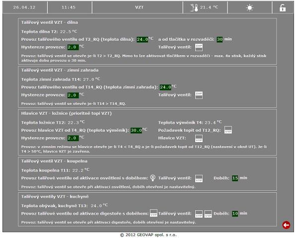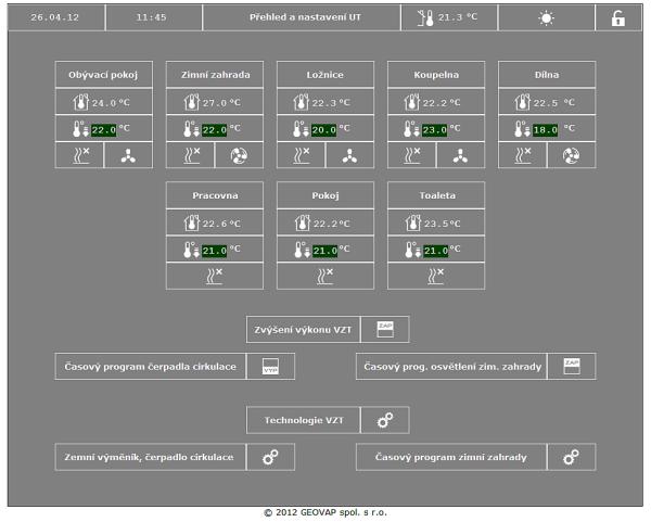 - technologie MaR (monitor a dohřev vzduchu VZT jednotky Atrea, řízení čerpadla zemního výměníku, čerpadla cirkulace)