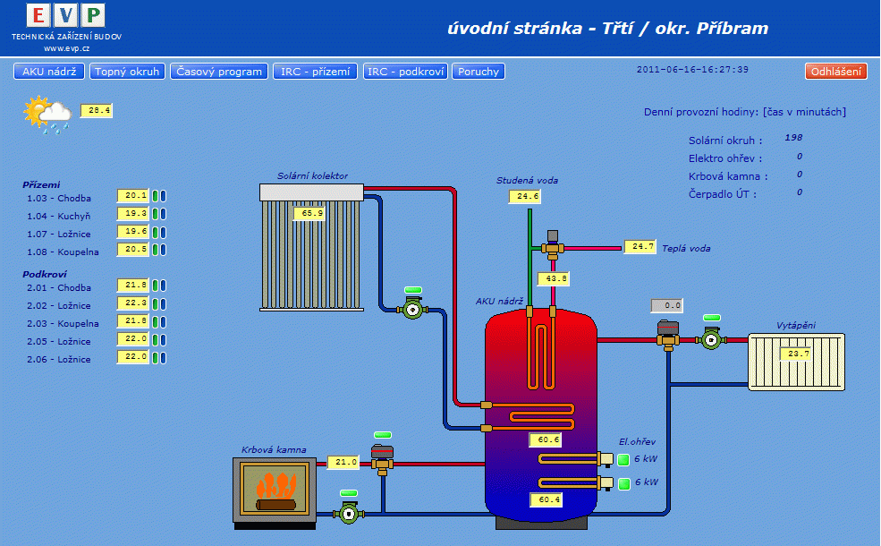 - poruchové a havarijní stavy ( max/min teploty, min tlak vody v út/solárním okruhu aj)