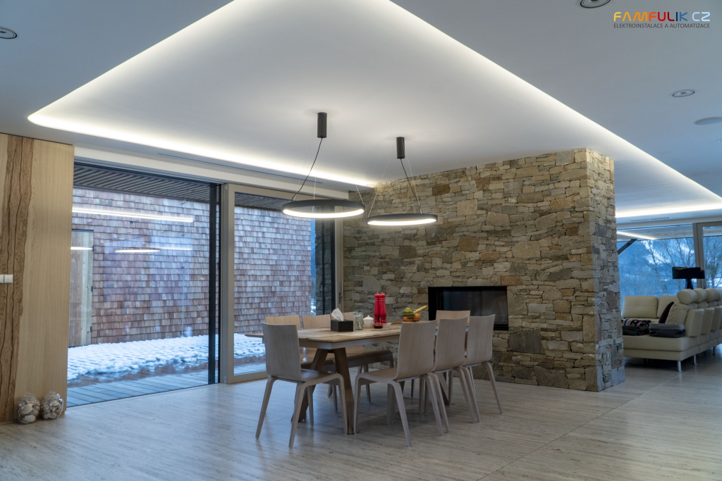 Mohutný kamenný krb jako přirozené centrum života obyvatel domu a také sklo, dřevo, beton a moderní technologie. Taková je vila stojící uprostřed přírody na severu Moravy. Atmosféru uvnitř domu dotváří designové LED osvětlení vyrobené z hliníkových profilů. Jednotlivá svítidla jsou originály, jejichž návrhy vznikly speciálně pro tento dům.