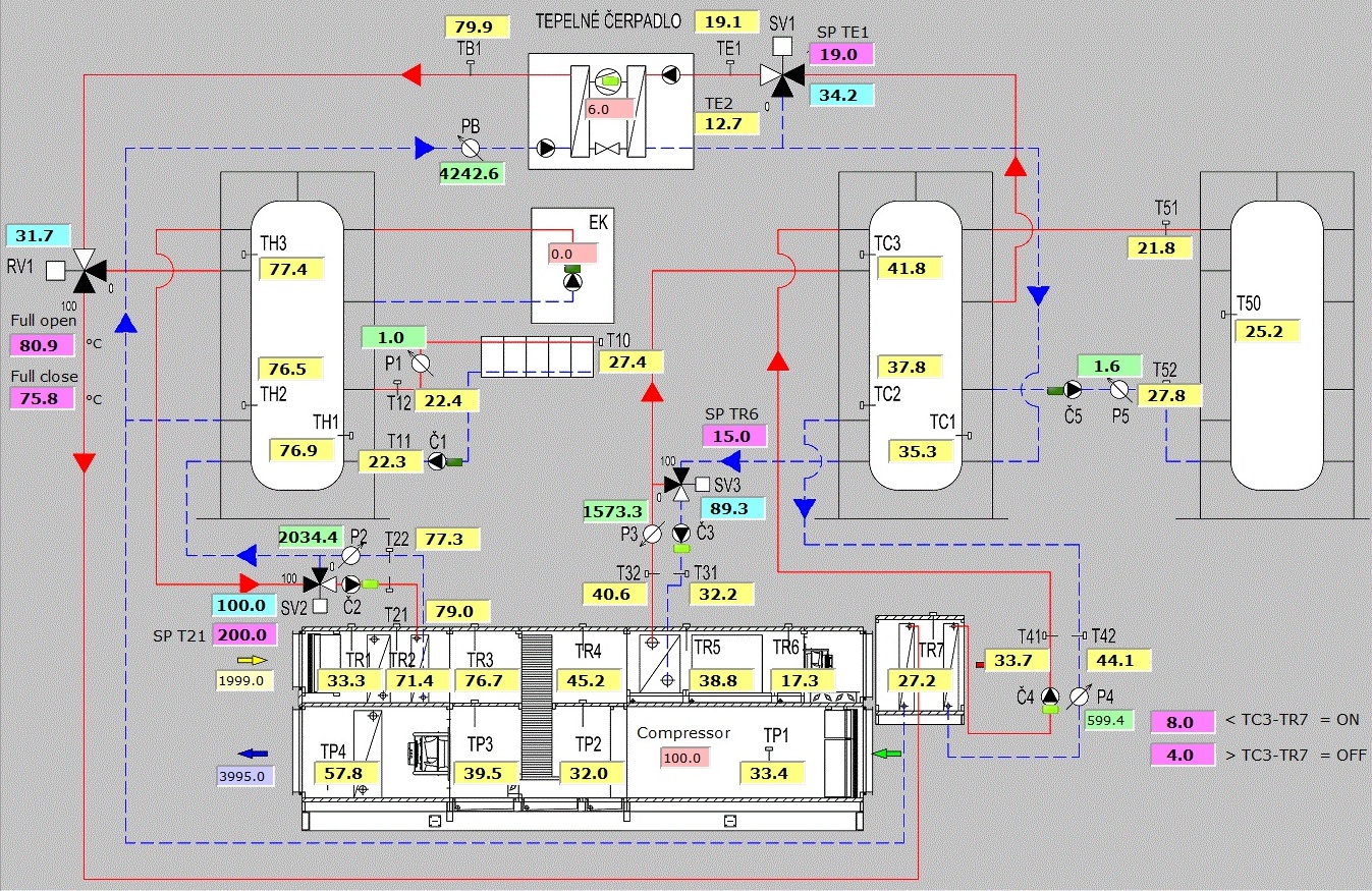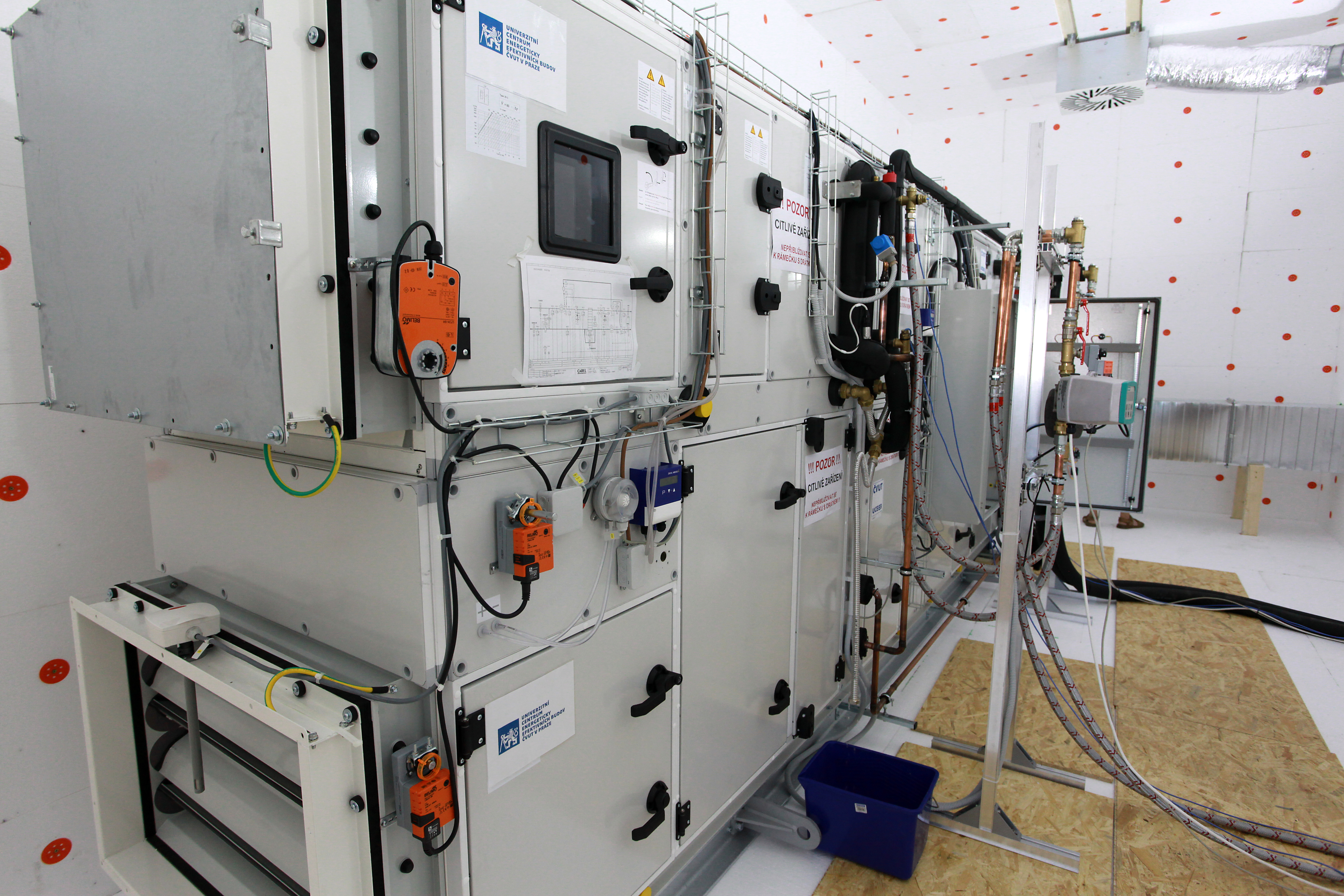 Ing. Pavel Pelan, který Foxtrot programoval, k energetické části řekl: „Kromě kombinovaných jsou použity i standardní fotovoltaické panely. Třífázovou instalaci napájejí hybridní střídače Studer spolupracující s bateriovým uložištěm BMZ a dále tepelné čerpadlo. Tedy součásti, které máme ověřeny u nás v Buštěhradu a používají se i v jiných budovách i v rodinných domech. Foxtrot se všemi těmito částmi komunikuje, průběžně měří parametry ve všech částech procesu a poveluje základní vzduchotechnickou jednotku tak, aby byl její chod energeticky optimalizován a výstup, tedy voda, maximalizován."
