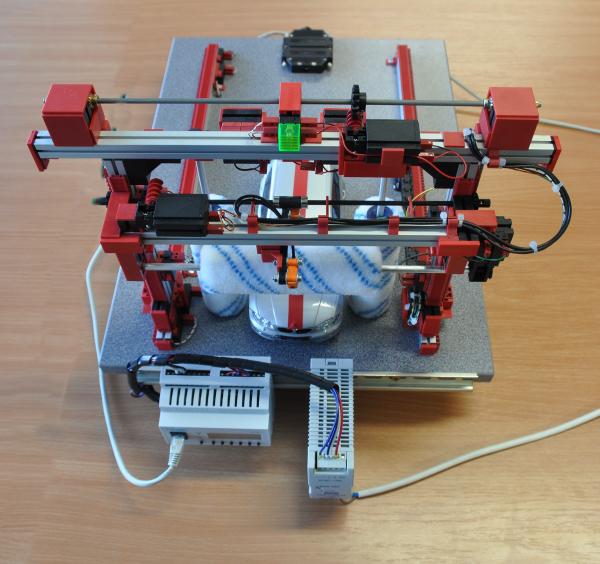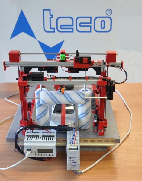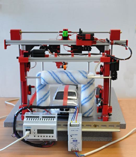 Kompaktní model myčky aut obsahuje 3 pohony a 6 snímačů. Je řízen pomocí PLC Foxtrot CP-1014.