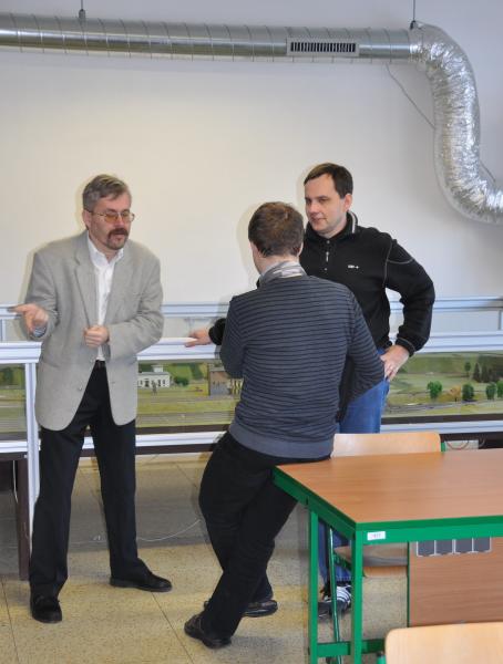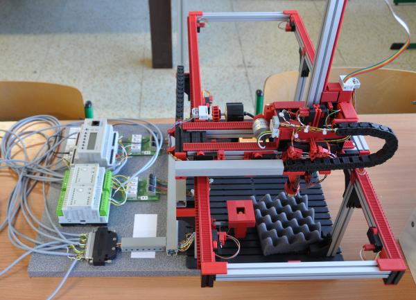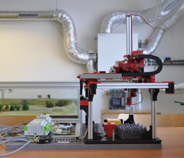 Model manipulátoru je vybaven 3 pohony, 1 elektromagnetem, 2 enkodéry a 9 snímači. Je řízen Foxtrotem CP-1014 s rozšiřujícícmi moduly IR-1501 a IB-1301.Model 3 osého manipulátoru, v pozadí rekuperační jednotka Duplex firmy Atrea