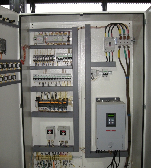 Použito je zde PLC Tecomat Foxtrot CP-1005 a frekvenční měniče LS (RS-485)