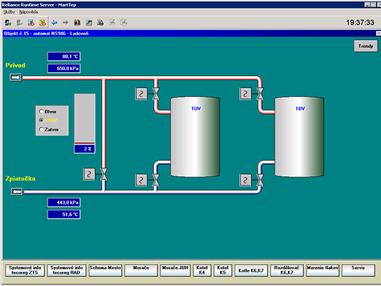 Prostřednictvím naší dceřinné společnosti Slovteco jsme v roce 2007 realizovali v Martinské teplárenské zakázku vybudování tepelného dispečinku za účelem řízení horkovodních tepelných rozvodů a měření spotřeby tepla. Pro řízení horkovodních tepelných rozvodů byly využity programovatelné automaty Tecomat TC650 spolu s rádiovými a GSM modemy CONEL. Data z tepelných rozvodů se přenášejí přes rádiovou síť, která sestává ze tří automatů Tecomat a osmi regulátorů AMiT.